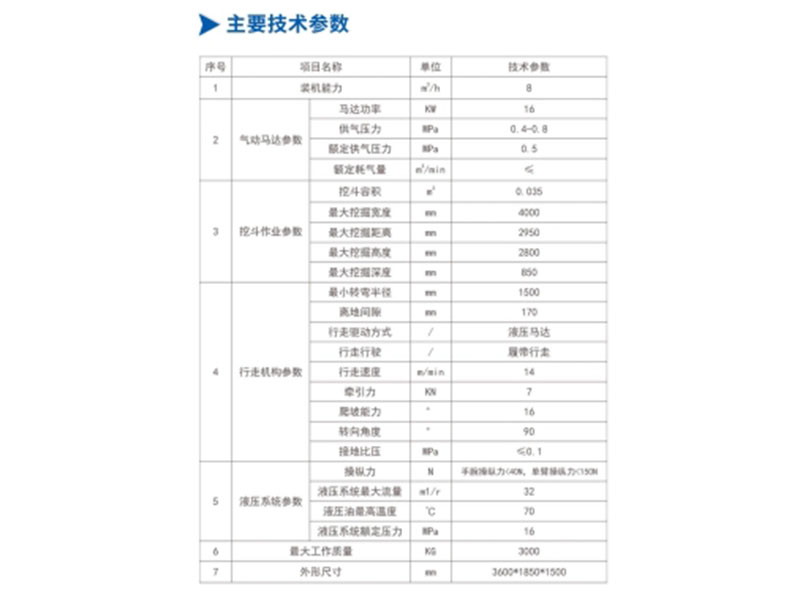 2.體積小移動靈活,礦用氣動巷道挖掘機的設計寬度以井下質量標準中人行道寬度zui低0.8米為上限,滿足90%以上的變形巷道施工條件